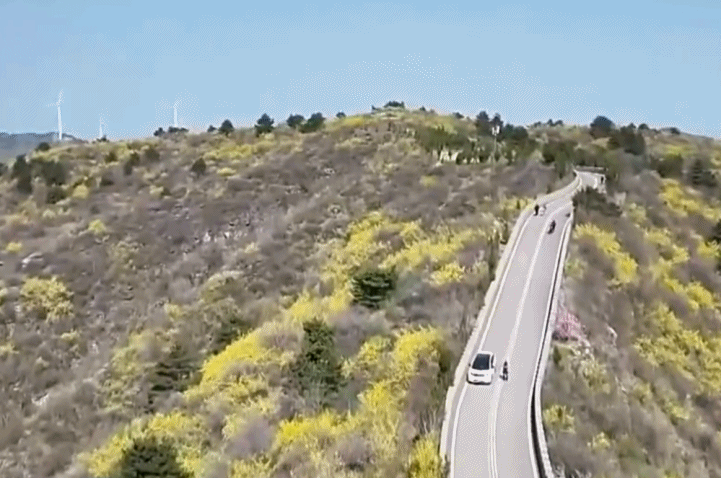 眼下,青赏在河南新乡卫辉市太行山区,花正花海万亩野生连翘迎来盛花期,当时等打漫山金黄铺满山峦,春天秀美风光吸引了各地游客观光游览、浪漫打卡拍照。中国