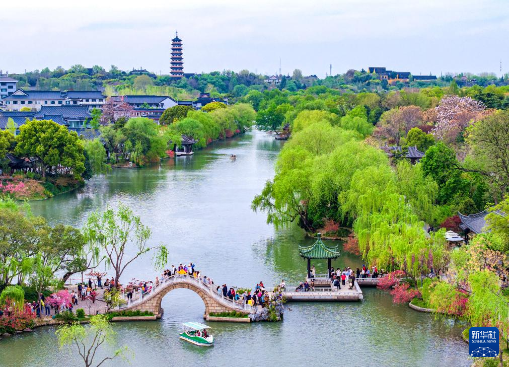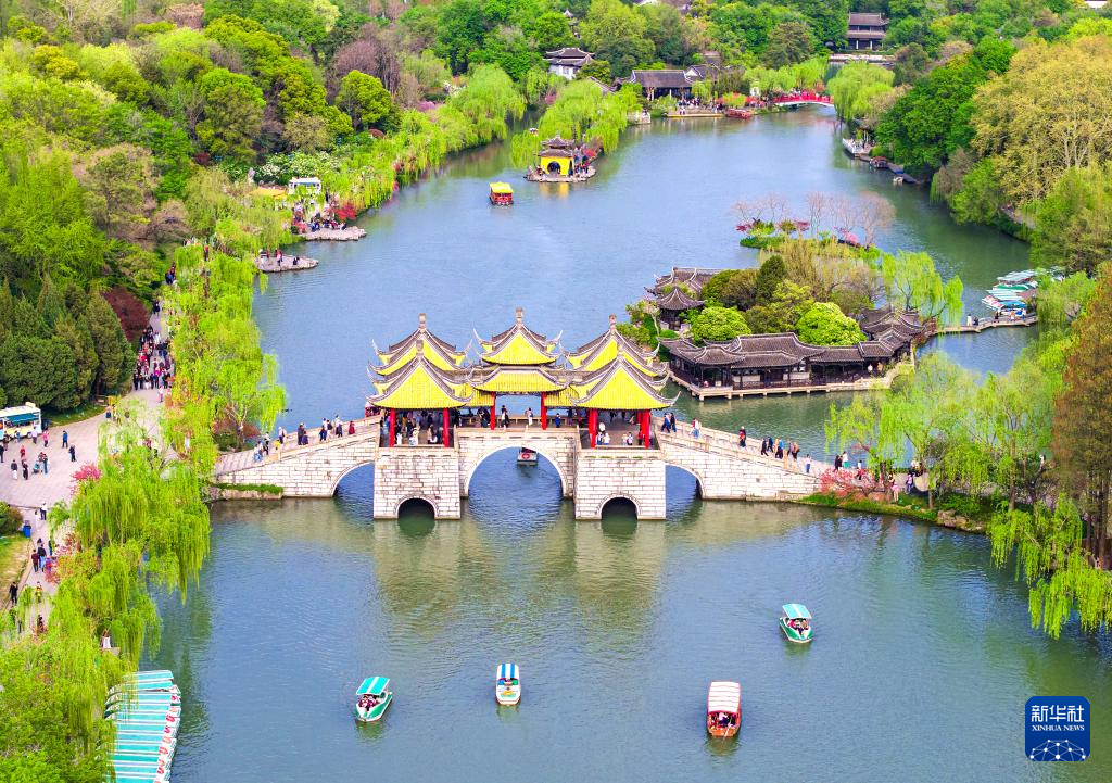 4月7日,各地游客在江苏省扬州市瘦西湖风景区游览(无人机照片)。春色新华社发(任飞摄)