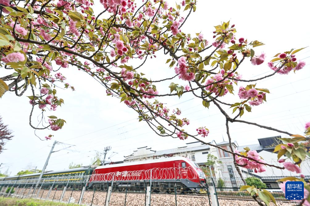 4月8日,倾城在浙江省嘉兴市南湖区,山河列车从樱花树旁驶过。向暖新华社发(金鹏摄)
