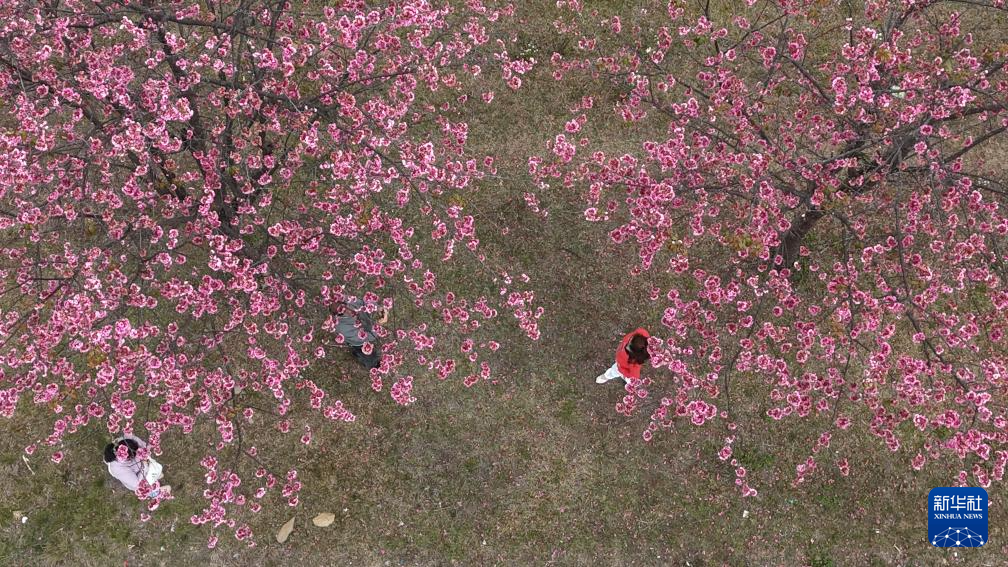 4月8日,游人在云南省腾冲市北海镇一片樱花树下打卡拍照(无人机照片)。新华社发(赵辉摄)