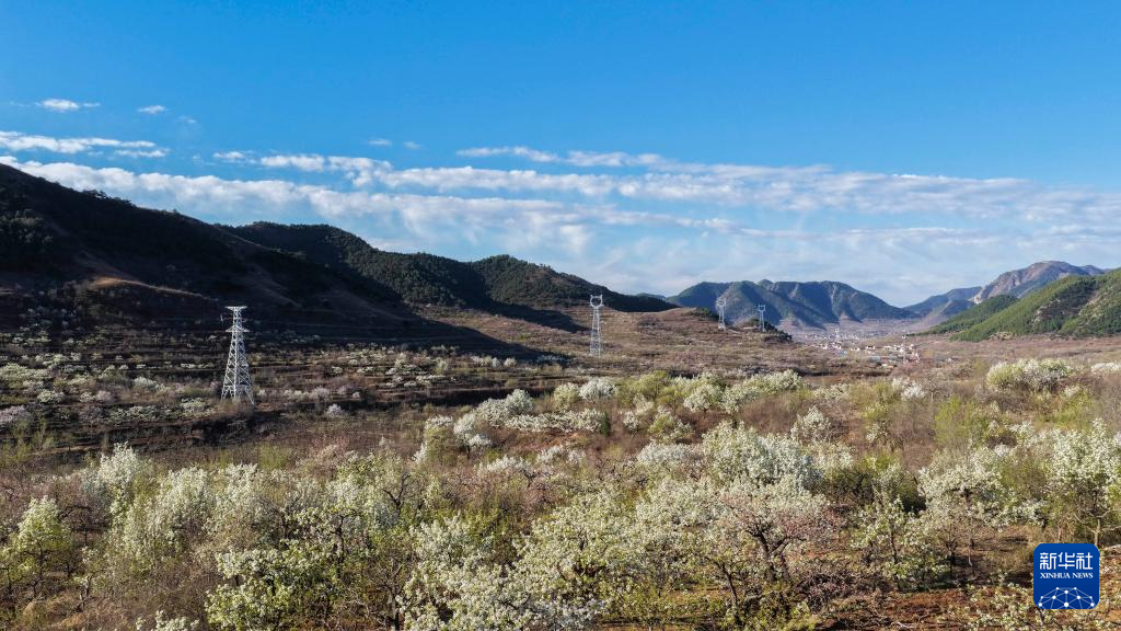 4月8日在河北省遵化市铁厂镇拍摄的向暖梨树沟春景(无人机照片)。新华社发(刘满仓摄)