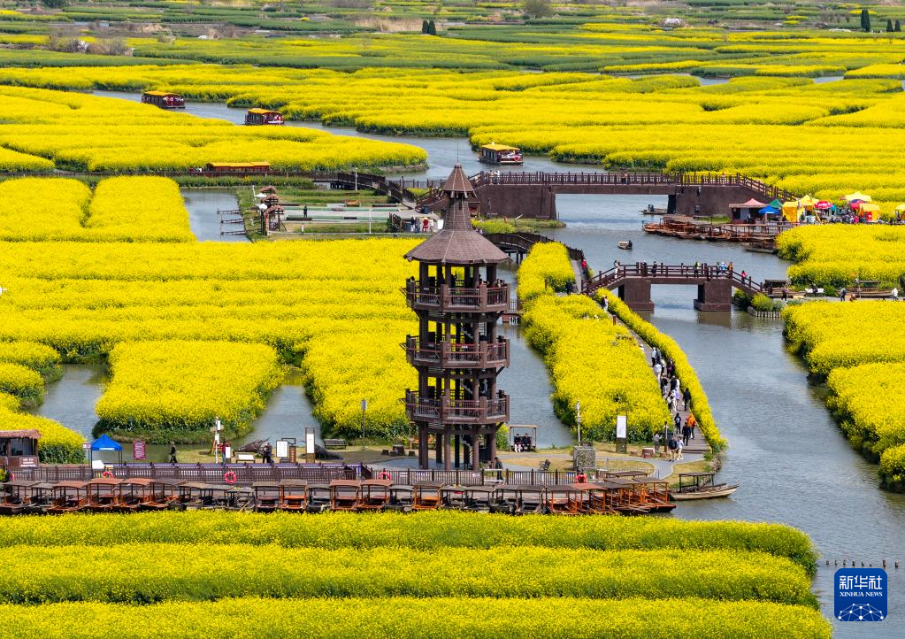 4月8日,各地游客在江苏省兴化市千垛景区赏花游玩(无人机照片)。春色新华社发(周社根摄)
