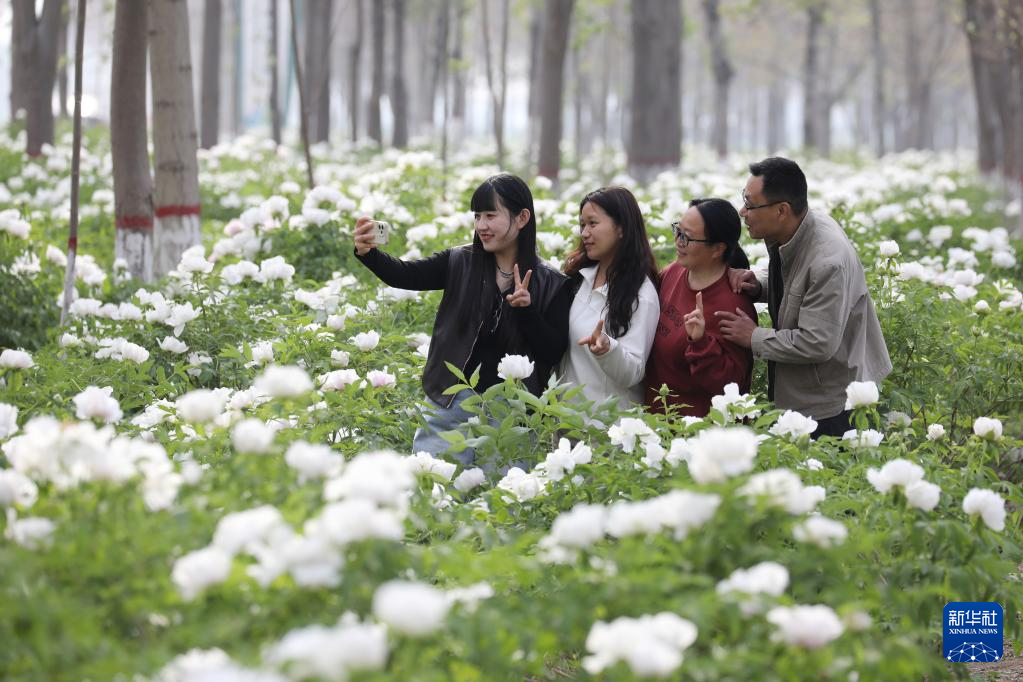 4月7日,游客在河南省焦作市温县国有实验林场芍药花海中赏花休闲。新华社发(徐宏星摄)