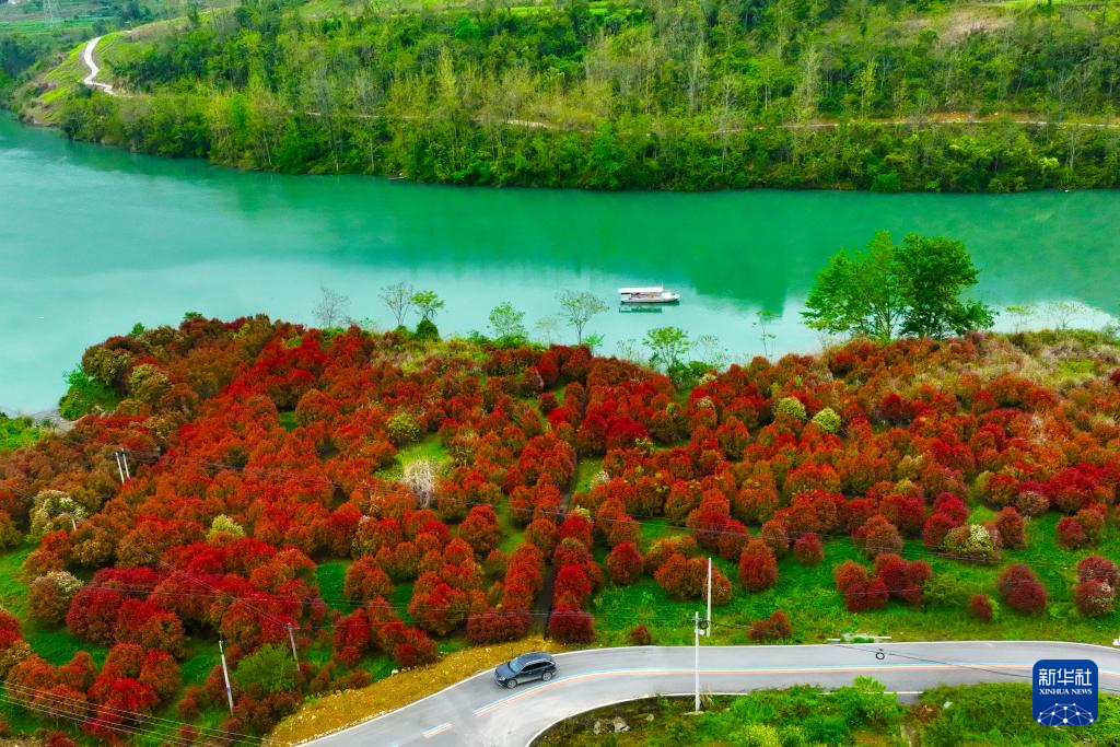 4月8日,村民乘坐过河渡船行驶在重庆市阿蓬江国家湿地公园阿蓬江上(无人机照片)。新华社发(杨敏摄)