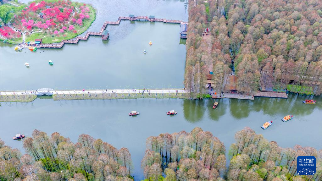 4月6日,游客在江苏兴化里下河国家湿地公园赏景游玩(无人机照片)。新华社发(周社根摄)