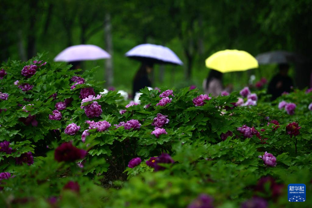 4月8日,游客在河南省驻马店市汝南县天中山文化园冒雨观赏牡丹花。新华社发(孙凯摄)
