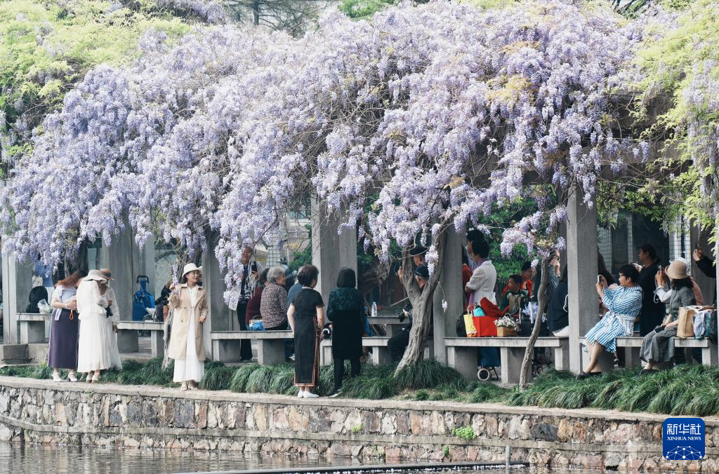 4月8日,人们在浙江大学华家池校区观赏盛开的紫藤花。新华社发(龙巍摄)