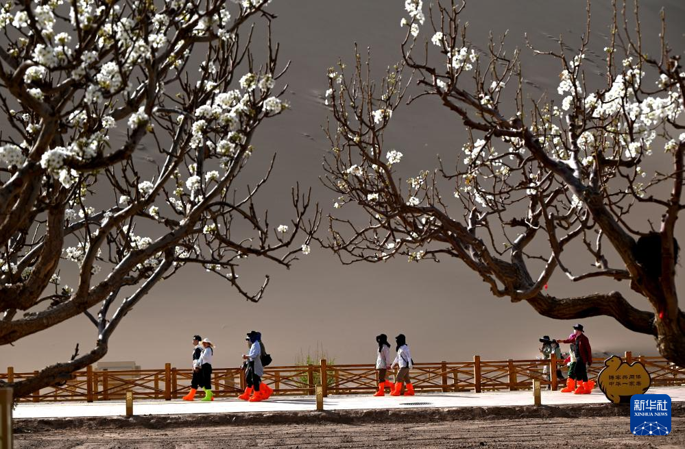 4月6日,游客在甘肃省敦煌市鸣沙山月牙泉景区游览。新华社发(张晓亮摄)